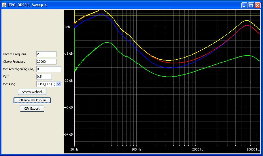 2) Letztens habe ich die Wobbelfunktion des JLab verwendet, um ein altes Röhrenradio durchzumessen, genauer gesagt den Teil vom Tonband-Eingang zum Lautsprecherausgang. Die Klangregelstufe übertreibt da gigantisch, was die Höhen und Tiefen angeht (mehr als +20dB) und bei der jetzigen Implementierung kommt man recht schnell an die Dynamikgrenze der TRMSC. Auch wenn man mit dem Vernierpoti so einpegelt, daß man bei den höchsten Pegeln im oberen Aussteuerungsbereich liegt, sobald man niedrigere Pegel der Kurve erreicht, dann wird die Kurve "eckig". Und der Meßwert der TRMSC wird ja zudem nie null, was das Meßergebnis erheblich verfälschen kann!