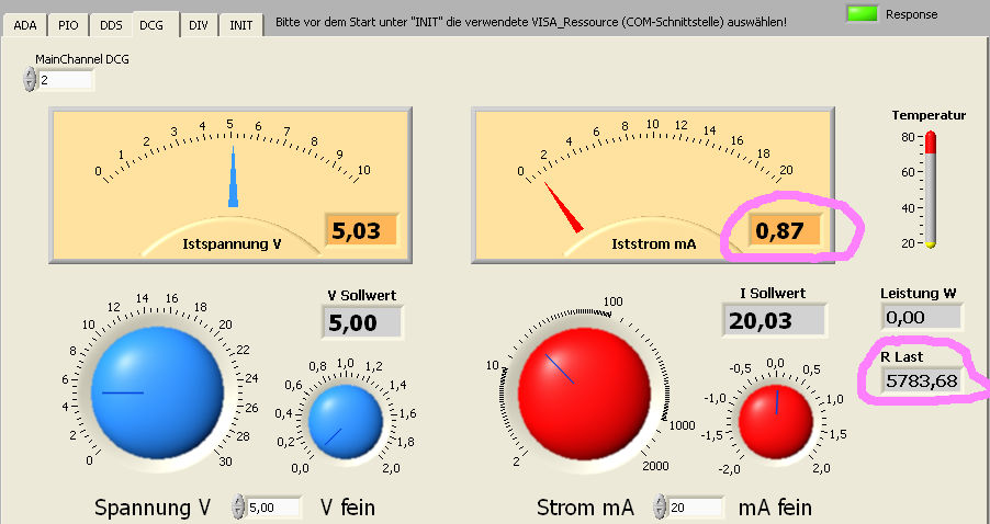 nachdem ich etwas mit DemoAll.vi rumgespielt habe ist mir da schon mal aufgefallen, das man diesem Virtuellem Instrument nicht blindlings vertrauen darf. Bei einer Soll,- und Ist-Spannung von 5V an einem 10k Widerstand kann kein Ist-Strom von einigen mA fließen, egal wie hoch man den Strom-Sollwert-Regler dreht.