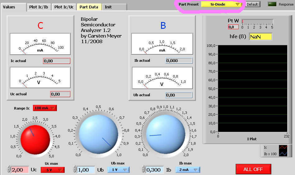 Wie es im Artikel steht und ich auch der Meinung bin, ist es für den Abgleich nicht nötig eine weitere außer der IFP-Spannungsversorgung anzuschließen. Mein Hauptproblem ist zur Zeit die c't-Syntax. Meine Ausdrucke mit dem Syntax Stand vom 17.09.2007 sagen, das es für das Auslesen des Strom-Istwertes drei Abfragen gibt, nämlich einmal für den A; mA und µA-Bereich. Mit der Eingabe wie es im Kapitel " Einstand " mit 2:msa? angegeben wird, scheint man den Strom-Istwert aus dem 2 Ampere-Bereich zurückgemeldet zu bekommen. Ein Test mit der Abfrageeingabe 2:msa1? scheint dies zu bestätigen, da der Rückgabewert mit #2:12=-1.182 wohl den Strom-Istwert besser aufgelöst darstellt,