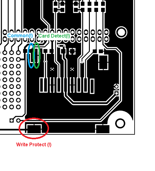 Problem #2: Die beiden Pads für den gemeinsamen Anschluß ("Common") und dem Schalter für Kartenanwesenheit ("Card Detect") sind im Layout vertauscht!