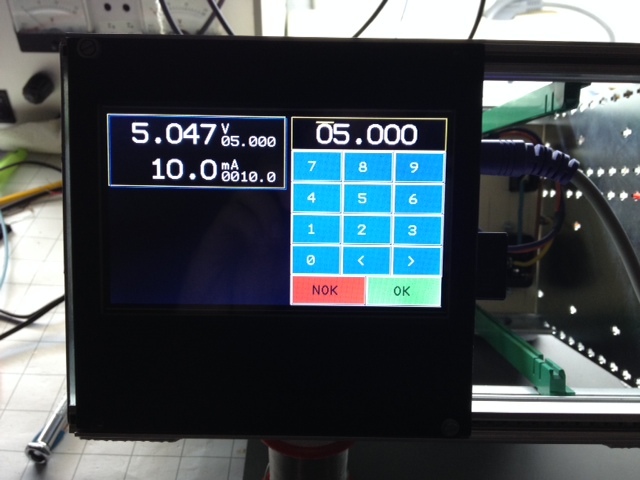Das Programm liest vom DCG (Addresse #2) Strom (mA) und Spannung ein und schreibt sie links auf den Bildschirm. Durch Antippen der Spannungs- oder Stromwerte kann man auf einer einfachen Tastatur die Sollwerte einstellen, mit ok bestätigen wir dann an das DCG übertragen.