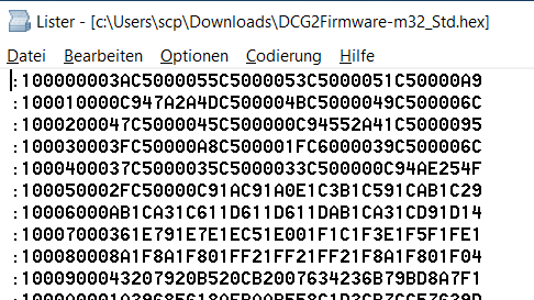 Versucht zu flashen hatte ich die Datei: DCG2Firmware-m32_Std.hex. Dabei trat die Fehlermeldung "Unsupported Format" auf. Ich hoffe, dass es sich um die richtige Datei handelt.